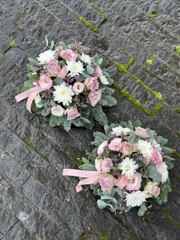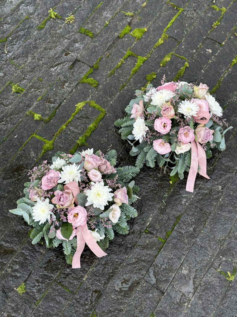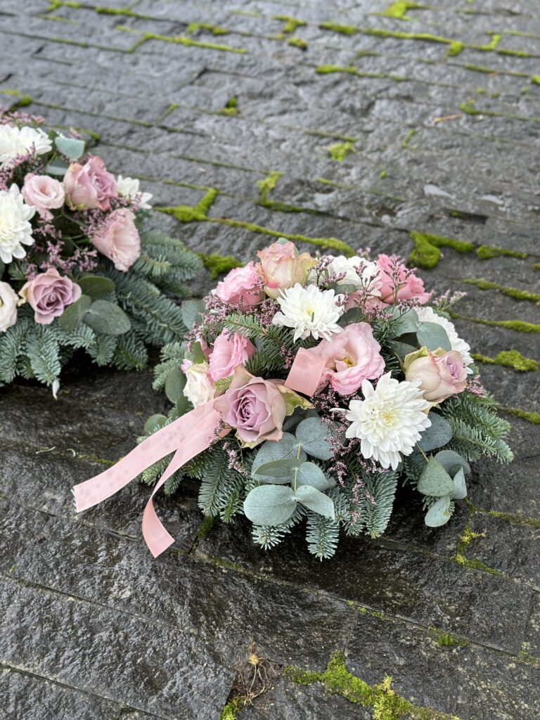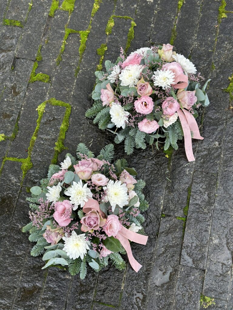 Gedulo kompozicija „Ramybės glėbys“ – tai gyvų gėlių aranžuotė, sukurta iš švelnių pastelinių rožių, baltų chrizantemų ir elegantiškų žalumos akcentų, simbolizuojančių ramybę, pagarbą ir šviesų prisiminimą. Ši kompozicija perteikia tylų atsisveikinimo žodį ir švelnų linkėjimą amžinam poilsiui, todėl yra itin tinkamas pasirinkimas norint pagerbti artimą žmogų jautria, estetiškai subtilia forma. Kiekviena gėlė parenkama itin atsakingai, siekiant sukurti harmoningą ir pagarbią atmosferą atsisveikinimo ceremonijoje.