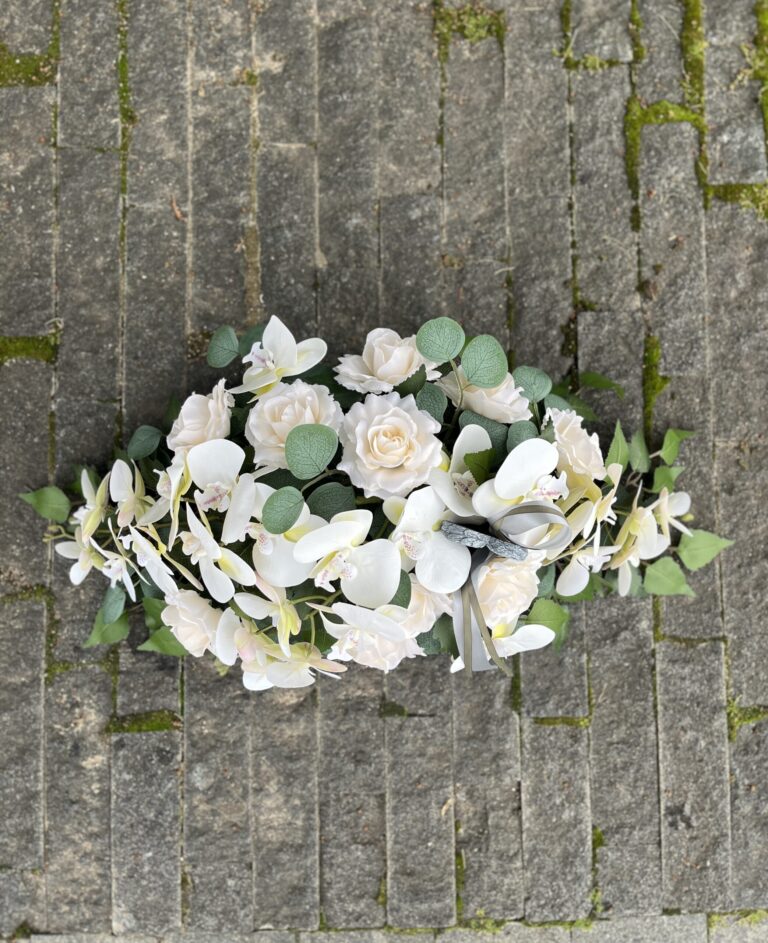 Gedulo kompozicija su dirbtinėmis orchidėjomis „Dangaus prisilietimas“ – tai ypatinga, subtili ir elegantiška gėlių kompozicija, skirta pagerbti artimą žmogų ir išreikšti nuoširdžią pagarbą. Ši kompozicija sukurta su gilia mintimi – švelnių spalvų rožės, baltos orchidėjos ir kruopščiai parinktos žalumos detalės suteikia ramybės ir šviesos pojūtį, kuris simbolizuoja taiką bei prisiminimų tyrumą.