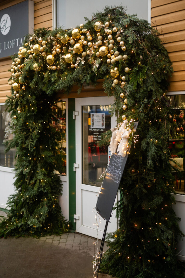 Vienas iš pavyzdžių – mūsų pačių Gėlių Loftas parduotuvė Gargžduose, kur įgyvendinome „Aukso žavesys“ koncepciją. Fasadas, papuoštas tankia spygliuočių arka su aukso ir šampano spalvos rutuliais bei subtiliu LED apšvietimu, tapo ne tik šventės simboliu, bet ir tikru traukos tašku praeiviams. Tokia dekoracija sukuria jaukią, šiltą atmosferą ir sustiprina įmonės įvaizdį.