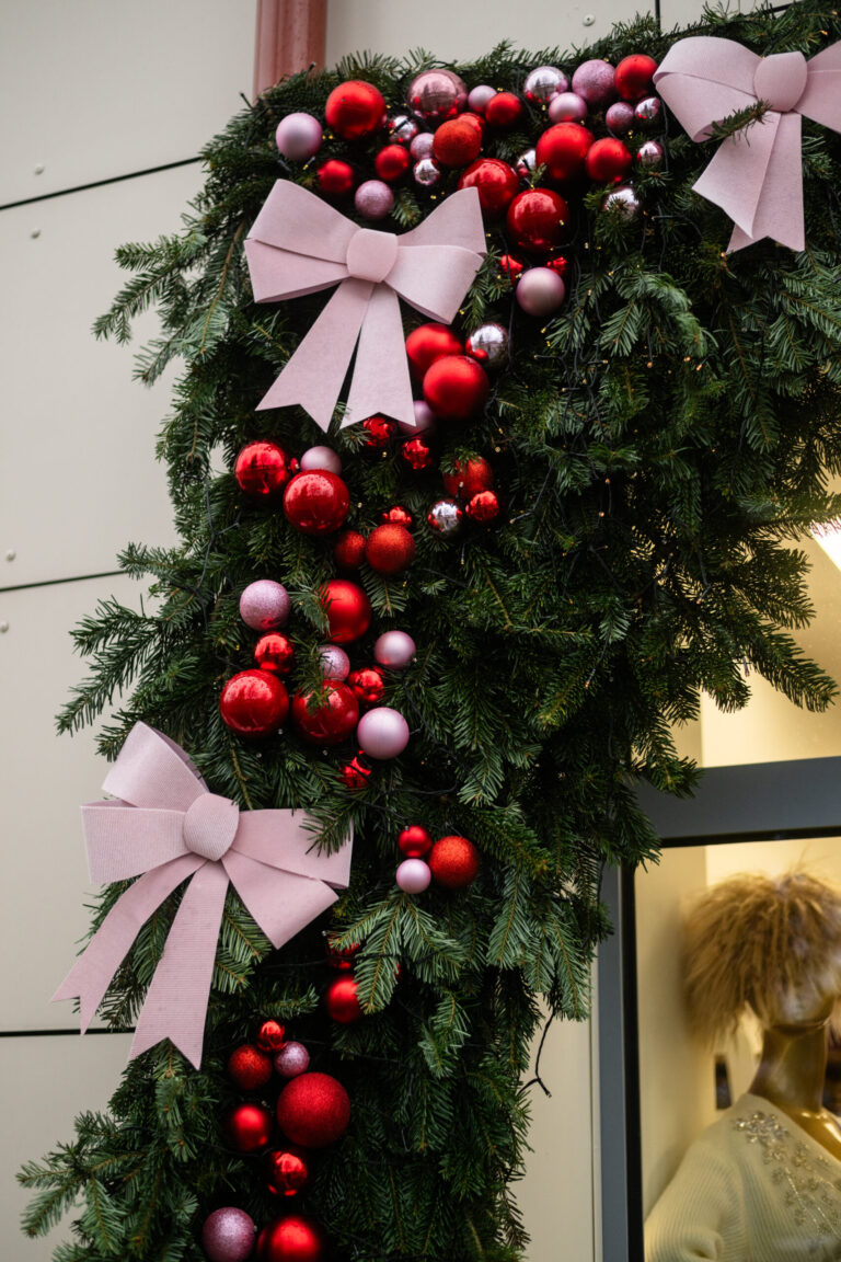Kalėdinis laikotarpis – puiki proga pasirūpinti savo verslo įvaizdžiu ir pritraukti naujų klientų. Kalėdinis fasado dekoras „Kaspinėliai“ – tai išskirtinis Gėlių Loftas sukurtas sprendimas, skirtas jūsų parduotuvės ar biuro fasadui papuošti. Šis dekoras išsiskiria klasikiniu spygliuočių žalumos ir švelnių rožinių bei raudonų akcentų deriniu. Dideli dekoratyvūs kaspinai kartu su blizgančiais rutuliais suteikia jūsų fasadui žavesio ir šventinės prabangos. Tai elegantiškas ir profesionalus būdas pasitikti klientus šventiniu laikotarpiu.
