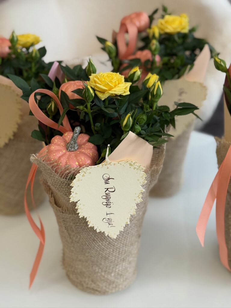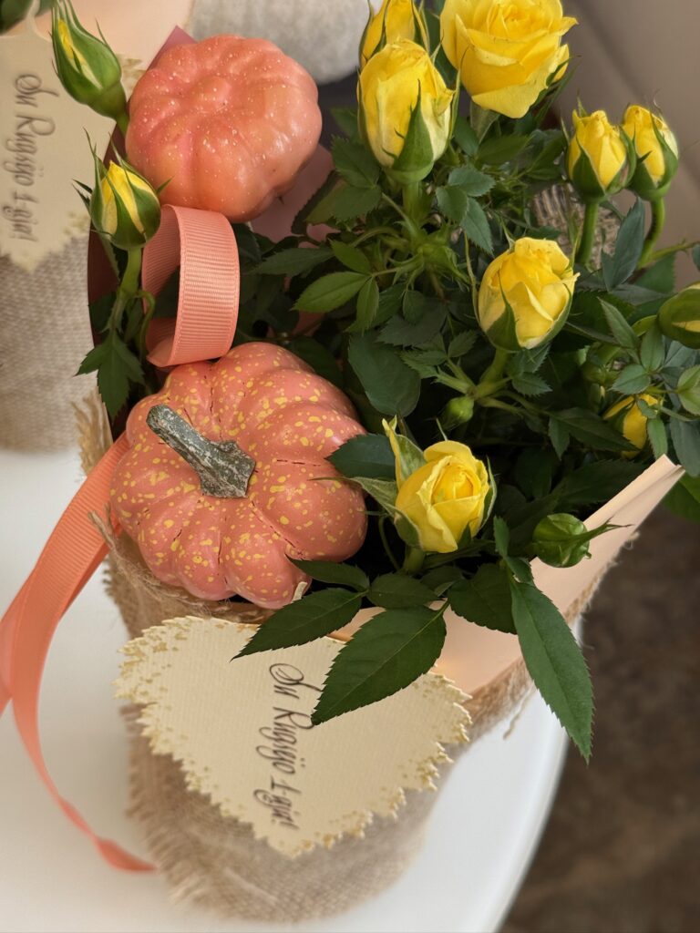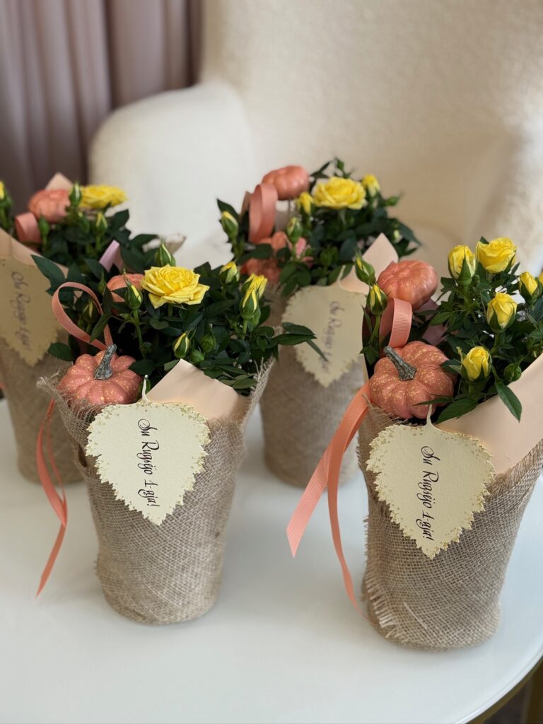 Visos vazoninių gėlių kompozicijos yra kuriamos mūsų pačių, tad gėlių išsiskleidimas, dekoracijų išdėstymas gali skirtis nuo to, ką matote nuotraukoje. Preliminarus kompozicijos aukštis 29 cm. , skersmuo – 20cm.