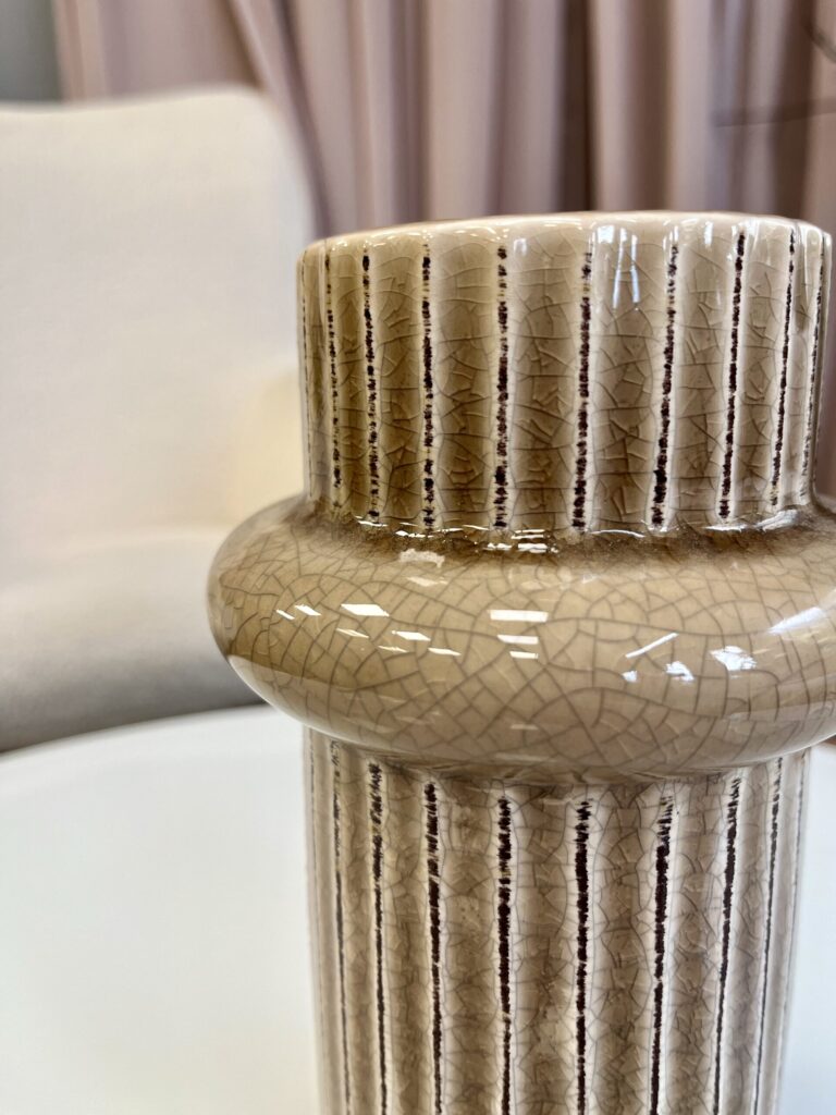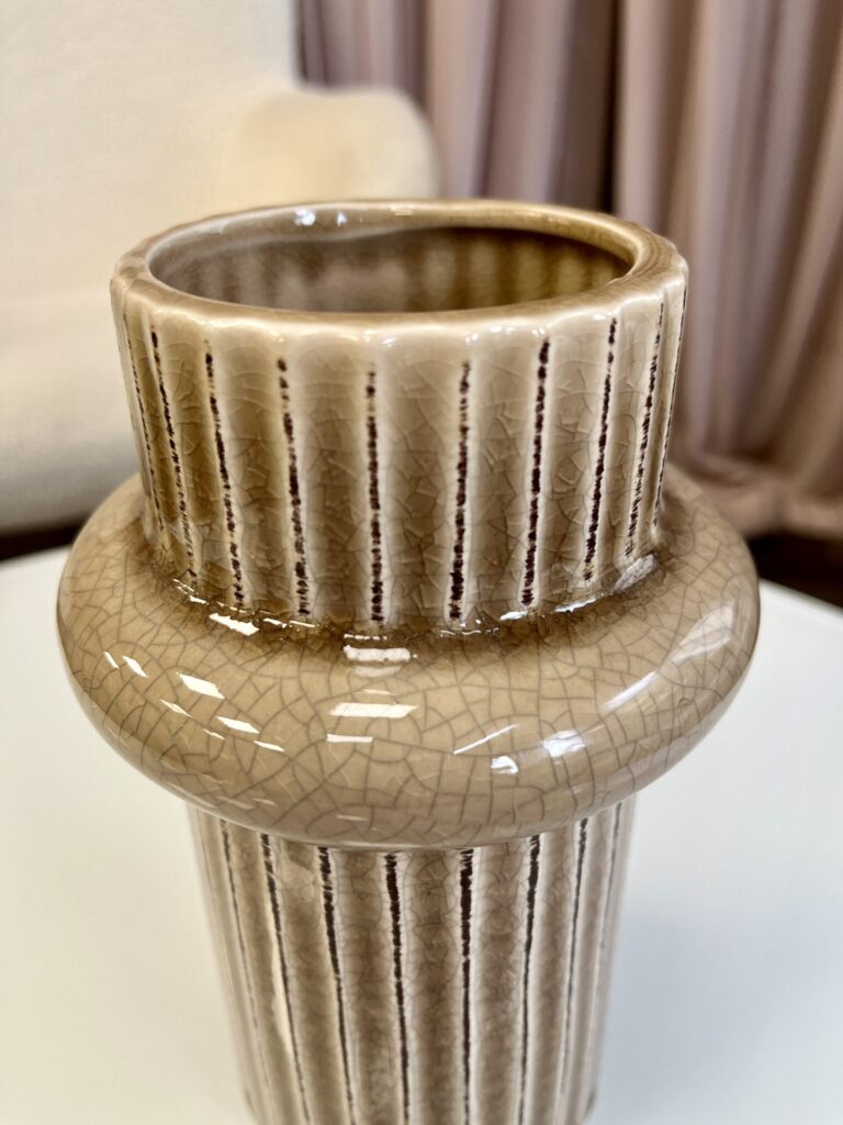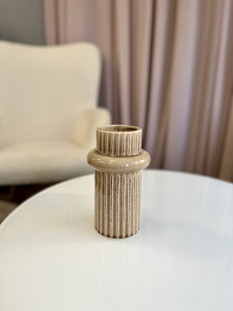 Smėlio spalvos vaza yra elegantiškas ir universalus akcentas, sukurtas tiems, kurie vertina diskretišką prabangą ir funkcionalumą. Vazos dizainas išsiskiria švelniu smėlio atspalviu ir blizgia emale, kuri subtiliai atspindi šviesą ir suteikia interjerui šiltą, rafinuotą atmosferą. Dėl kompaktiškų matmenų — aukštis 20 cm, skersmuo 7,5 cm — vaza idealiai tinka tiek mažesniems stalams ir konsolėms, tiek kaip papildomas elementas didesnėse kompozicijose.